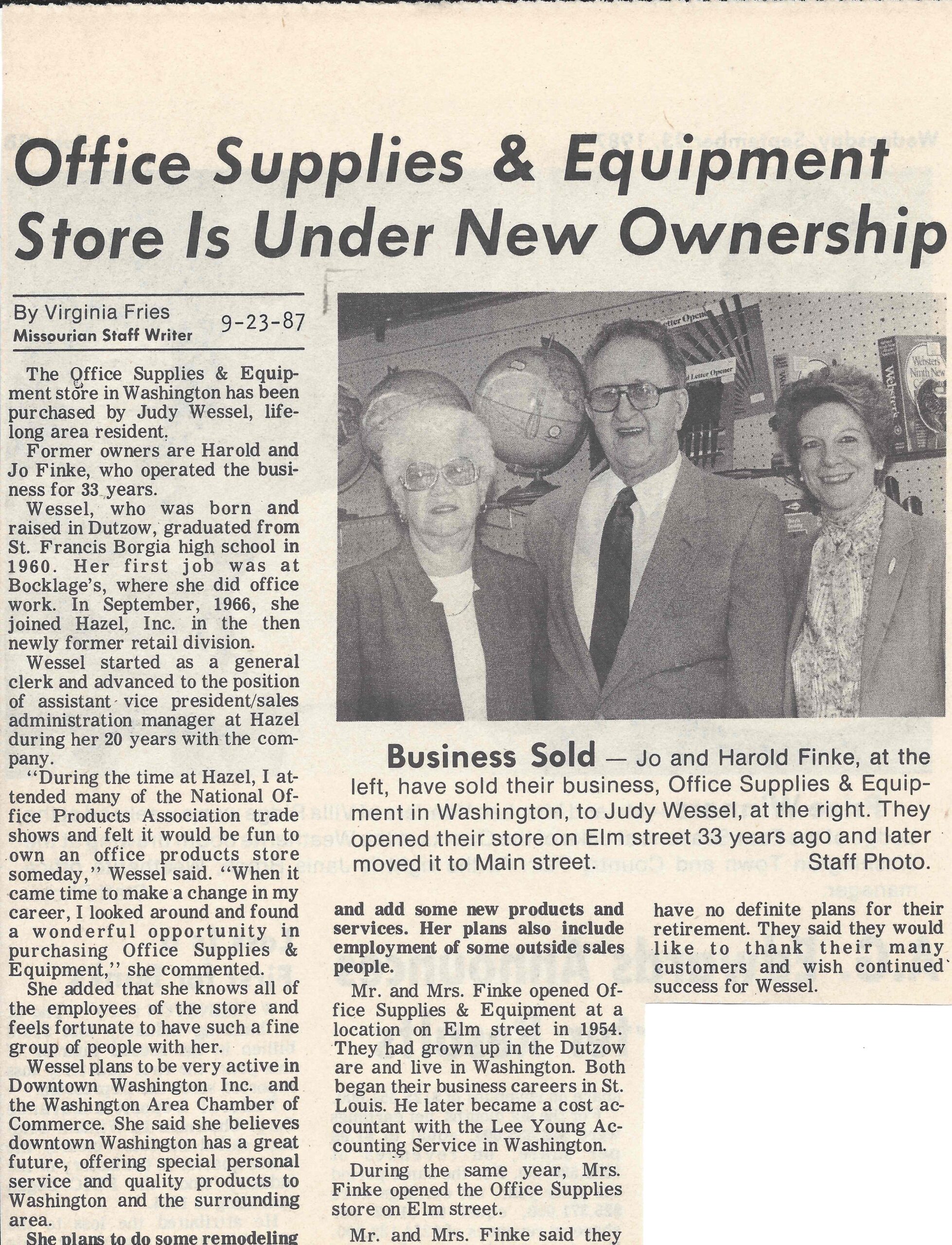 After more than three decades of serving the Washington community, founders Jo and Harold Finke sold Office Supplies & Equipment in September of 1987.