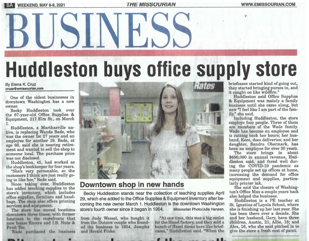 In March 2021, Washington native Becky Huddleston purchased Office Supplies & Equipment, becoming the fourth owner of the downtown business since it first opened in 1954.