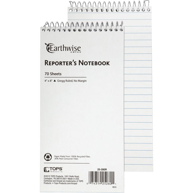 Ampad Earthwise Reporter's Notebook - 70 Sheets - Wire Bound - Front Ruling Surface - 0.34" Ruled - 15 lb Basis Weight - 4" x 8" Sheet Size - White Paper - WireLock, Chipboard Backing, Micro Perforated, Easy Tear, Snag Resistant - Recycled - 1 Each
