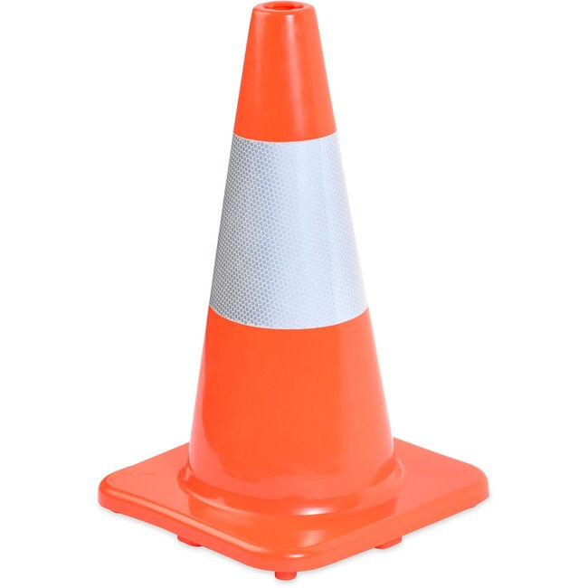 Sturdy molded, traffic cone features a reflective strip for maximum visibility when used outdoors. Stack with other cones for easy storage. Molded-PVC construction features a tread at the bottom to grip pavement and more. Inside is hollow. Cone weighs 2-1/2 lb.
