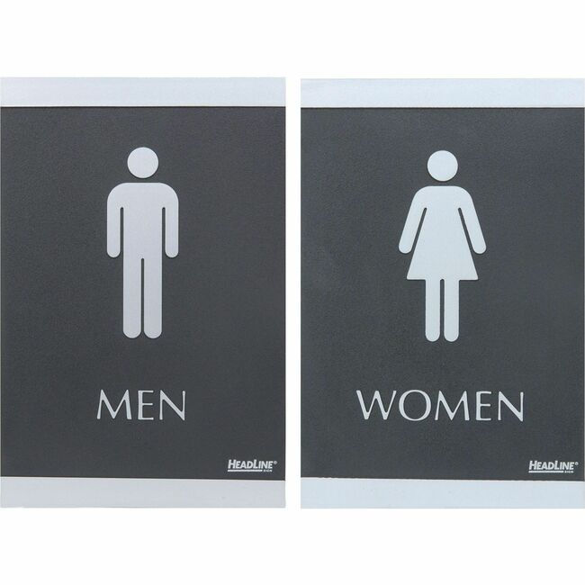 Headline Signs ADA MEN/WOMEN Restroom Sign - Print/Message "Men" , "Women" - 6" Width x 9" Depth - Rectangular Shape - Silver Print/Message Color - Adhesive Backing, Durable, Pictogram, Self-adhesive, Braille - Plastic - Black, Gray - 2 / Set