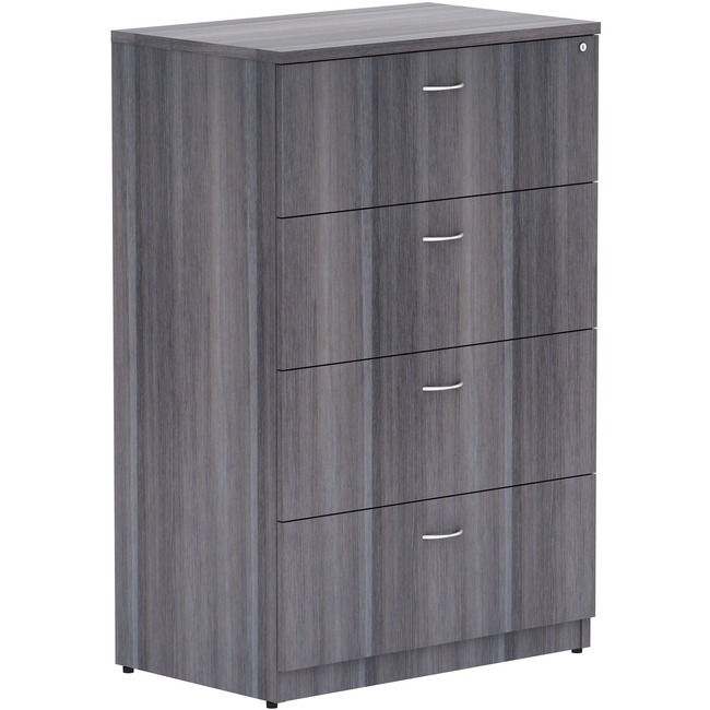Four-drawer lateral file is part of Lorell Essentials Series Laminate Furniture with high-quality laminate construction and a contemporary design. Weathered Charcoal laminate top is 1" thick for durability. File drawer accommodates letter-size and legal-size files with included hangrails. Drawers roll smoothly on steel ball-bearings with full extension. Central locking system locks all drawers at once. Anti-tip feature allows only one drawer to be opened at a time. Design also includes 3mm PVC edges and adjustable levelers for stabilization.