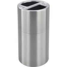 Make a lasting first impression while helping the environment. The Dual Recycling Receptacle includes two separate liners to help keep your recyclables separate while leaving any work space uncluttered. The lid comes off so the bag can be hidden from sight. The smooth and sleek aluminum recycling center features a satin finish to blend in with any office ambiance. Customize the receptacle with the included decals. Each side of the receptacle holds 15 gallons for a total, 30-gallon capacity.