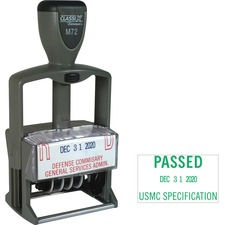 Marketing Information:Customizable plastic self-inking date stamp delivers up to four lines with 25 or 28 characters per line. Ideal for messages, dates and information. No stamp pad required. Stamp uses replaceable ink cartridges. Stamp has a lightweight, sleek plastic design for easy handling. Heavy-duty plastic frame is durable for years of service. Deeply molded bands provide crisp, clean impressions every time. Date stamp contains a high percentage of recycled material. Impression size is 1-1/4" x 2-1/8". Contact customer service to customize stamp. Complete orders are shipped within 48 hours of receipt by Xstamper.